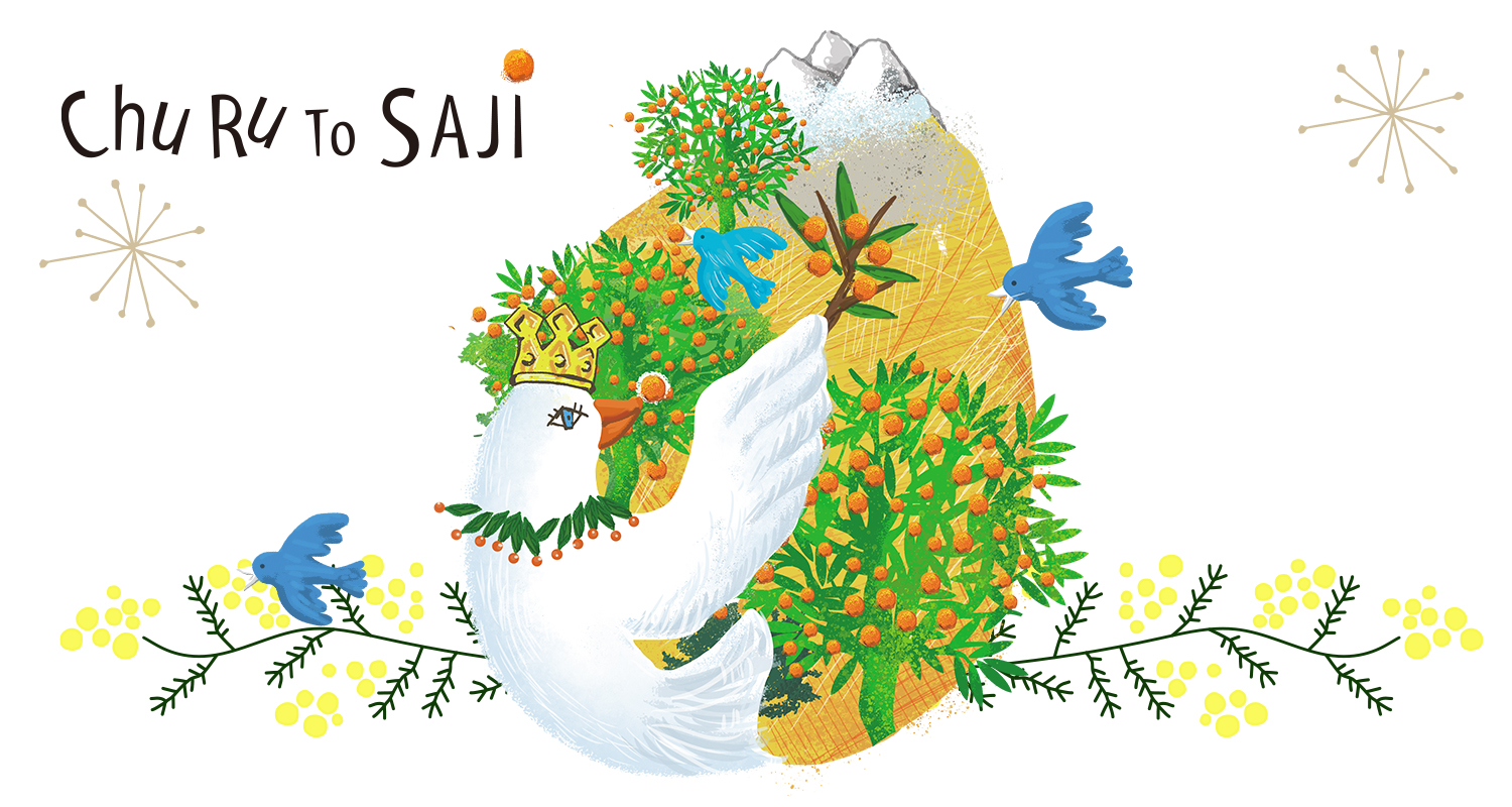 - サジー の産地の鳥は毛並みがいいという地元民の声から鳥の王様が主役のデザイン